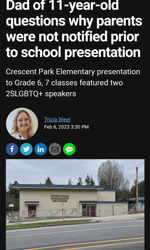 Consider being a parent who has expressed valid concerns about your child's education, only to witness teachers bypassing your rightful authority. In a recent incident, this school neglected to inform parents about a presentation by two 2SLGBTQ+ facilitators (a man dressed as woman) focusing on "human connections and the importance of empathy and inclusivity." They say that no one is attempting to indoctrinate your children, yeah right! Let's prioritize the protection of our children's innocence! Leave the kids alone!!!