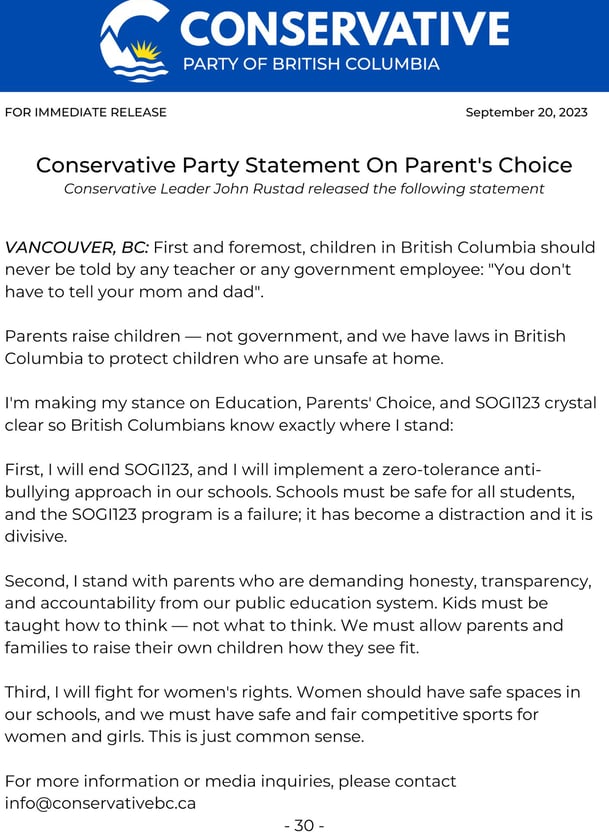 It's truly invigorating to witness a politician take a clear stance! John Rustad, the leader of the Conservative Party of BC, is unapologetic about his position—he advocates for transparency with parents, aims to replace SOGI123 in BC due to its perceived inadequacy, and strives for safe spaces and equitable competition between genders. These policies resonate with us wholeheartedly.